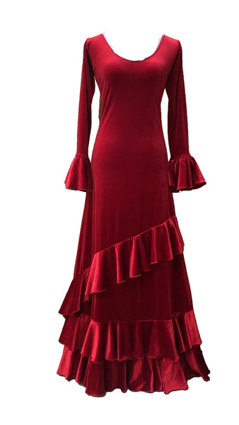 Un vestido con la elegancia del terciopelo y la comodidad de la elastina, con una subida en el último volante que rompe con el diseño tradicional y dota a la prenda de un estilo más desenfadado. Las mangas son largas y con una terminación de tres volantes pequeños del mismo tejido. El escote es en pico y cerrado en la espalda hasta el final. Si en el catálogo no encuentras el color que necesitas y quieres obtener el mantoncillo a juego realizado a mano y con flecos en seda, se puedes poner en contacto con nosotros y le informaremos.